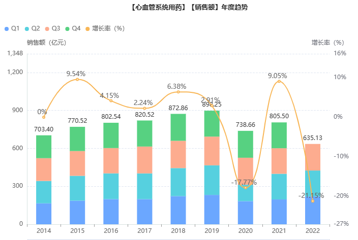 目前,心血管疾病已成为全球面临的重大的公共卫生问题。随着人口老龄化的加剧,心脑血管疾病已成为老年人常见疾病之一,尽管近年来心血管药物市场(不含中成药)的总体院内市场有所下降,但相关用药市场需求依然可观。据药融云统计,中国心血管药物市场(院内)销售额峰值近900亿元,近两年有所下滑,2021年总额805亿元。