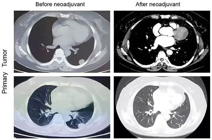 图2. 新辅助治疗前后左肺腺癌胸部CT图像