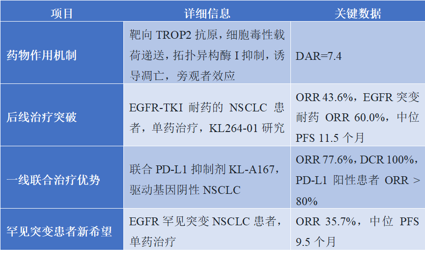 该药物的临床疗效在关键性OptiTROP-Lung03研究中得到验证。该研究纳入了43例经多线治疗的晚期NSCLC患者,其中包括22例EGFR-TKI耐药患者。研究数据显示,在总体人群中,客观缓解率(ORR)为43.6%。值得注意的是,在EGFR突变亚组患者中,芦康沙妥珠单抗单药治疗展现出更为显著的疗效,ORR高达60%。此外,该亚组患者的中位缓解持续时间(DoR)为8.7个月,中位无进展生存期(PFS)达11.5个月,中位总生存期(OS)为22.7个月,12个月和18个月的OS率分别高达81.0%和76.2%,表明该药物能为EGFR突变患者带来持久的生存获益。