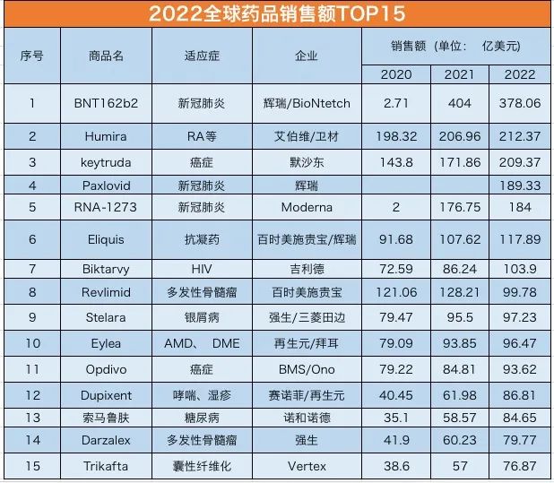 2022年全球畅销药TOP15榜单