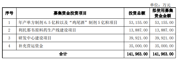 本次募集资金用于项目及拟投入的募资金额为:年产单方制剂6.5亿粒以及“鸡尾酒”制剂5亿粒项目,拟使用募集资金金额约5.32亿元;利托那韦原料药生产线建设项目,拟使用募集资金金额约1.39亿元;研发中心建设项目,拟使用募集资金金额约3.99亿元;补充营运资金,拟使用募集资金金额3.50亿元。有利于进一步聚焦公司主营业务,扩大产能,是在核心技术基础上对现有业务的进一步加码。