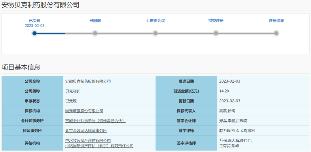 2023年2月3日:安徽贝克制药股份有限公司科创板IPO获上交所受理,本次拟募资约14.2亿元。