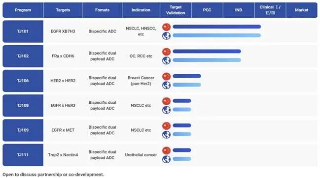 TJ108的价值,恰恰戳中了传统ADC药物的痛点。过去,单靶点ADC面对肿瘤时总有些力不从心,肿瘤细胞要么通过下调或突变靶点藏匿,要么通过上调药物外排泵、改变细胞内吞途径,对单一机制的毒性载荷产生耐药性,这也是很多患者用药后效果打折扣的关键。而TJ108同时锁定EGFR和HER3,能更精准地找到癌细胞;搭载TOP1抑制剂和微管抑制剂两种不同机制的毒性载荷,又能从不同路径攻击肿瘤,减少耐药的可能。