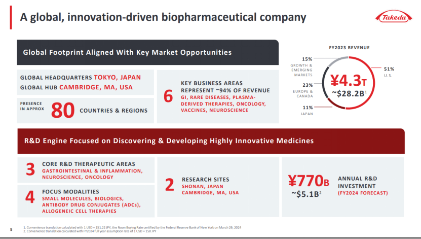 武田业务覆盖约80个国家和地区,2023财年收入282亿美元,74%的收入来自北美和欧洲,仅美国市场就贡献了51%的收入