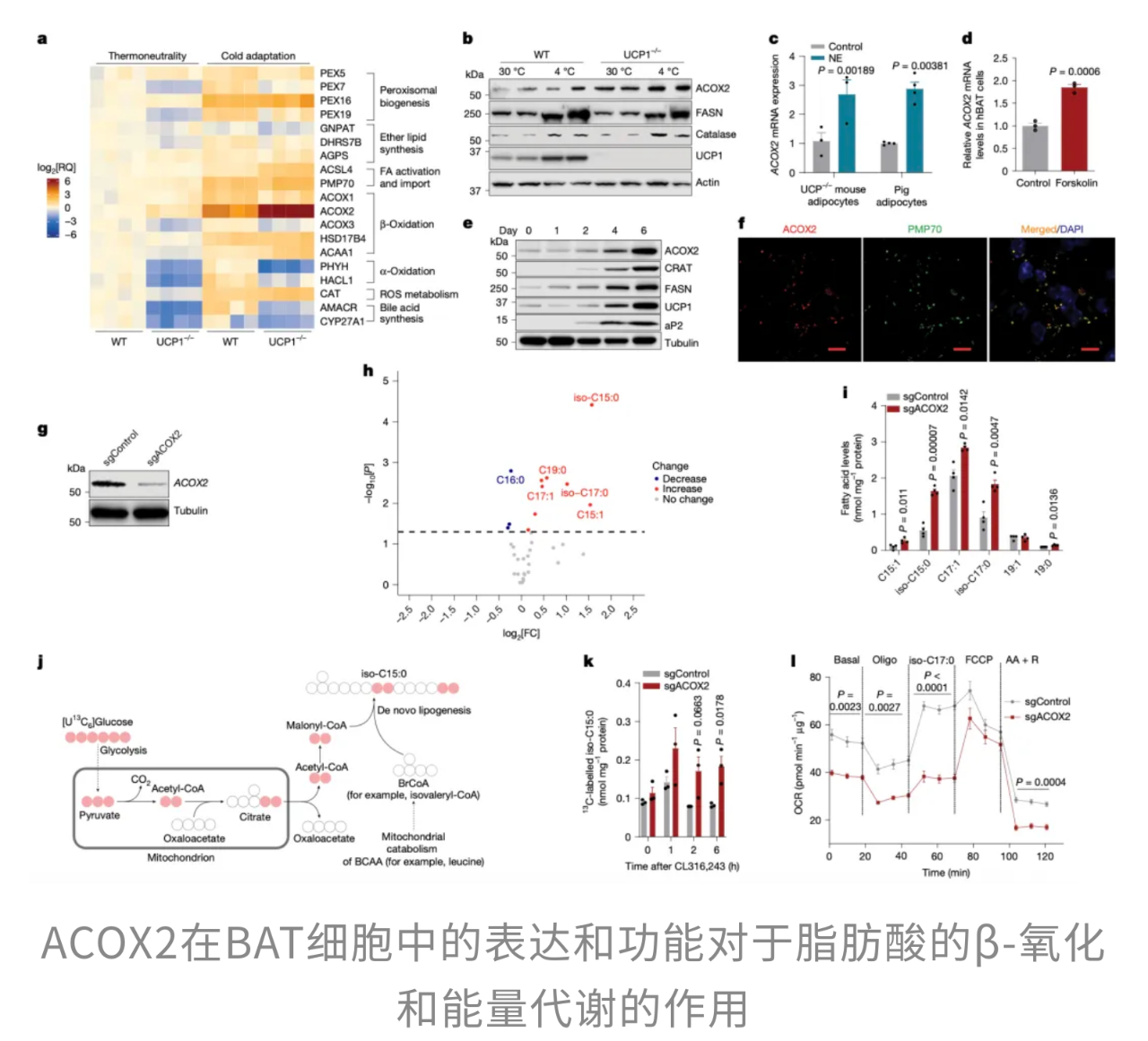 被激活的ACOX2并非摆设,它立即开始氧化并消耗细胞内的mmBCFA,提升耗氧率,相当于启动了一条专门用于产热的能量通路。当传统的UCP1产热系统不在场或“火力不足”时,它就能无缝补位,成为维持体温和能量稳态的“备用发动机”。