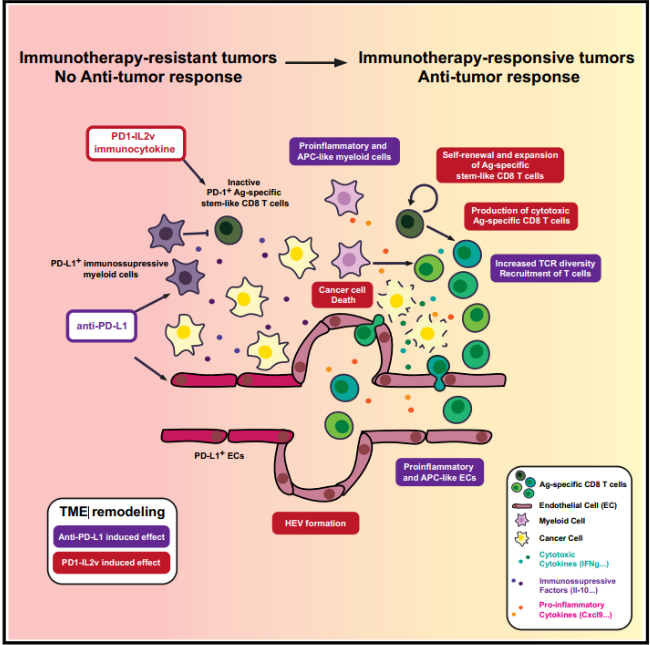 这项工作表明PD1-IL2v与抗PD-L1能够在抗肿瘤免疫中发挥协同作用,增强肿瘤抗原特异性CD8+ T细胞的浸润程度。RT5胰岛细胞瘤和神经胶质瘤移植肿瘤模型中获得的数据支持将PD1-IL2v联合抗PD-L1用于临床试验。