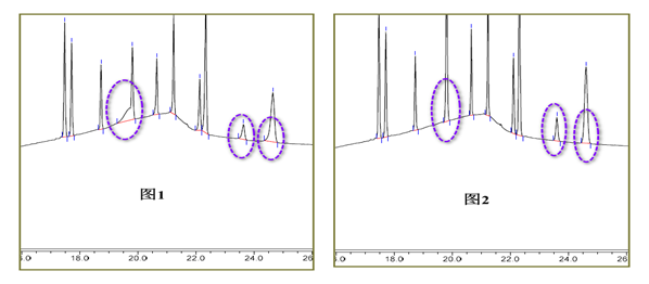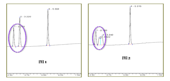 图1:对照品溶液; 图2:对照品+供试品溶液