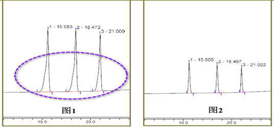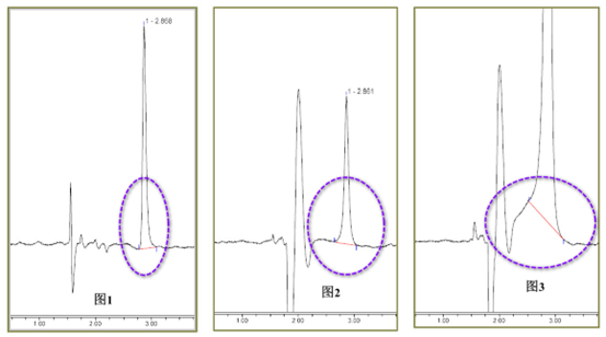 从图中看出三个杂质峰均出现不同程度的前延现象,且从左到右三个峰的前延效果依次减弱,再根据所采用稀释液和流动相,基本就能判断出是因为稀释液不匹配导致的。当进样体积减小,峰型就变好,则肯定就是容积效应问题。此时如果还想获得一个好的峰型只要降低进样体积或者更换低比例有机相稀释液即可。