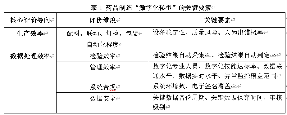 公司确立“分析问题—构建模式—推行举措—评价改进”PDCA循环的精益理念和工作思路,明确了药品制造“数字化转型”的关键要素(见表1),为开展数字化工作、逐步构建优化与质量改进提升提供了方向和目标。