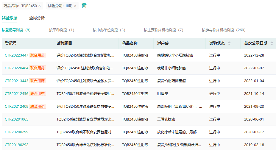 TQB2450是正大天晴开发的一种全新序列的靶向程序性死亡配体-1(PD-L1)的人源化单抗。该药已在中国获批开展多项临床试验,其中多个适应症进入3期临床,包括复发铂耐药卵巢癌、三阴乳腺癌、头颈部鳞状细胞癌、非小细胞肺癌等。