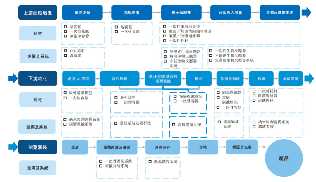 上游专注于细胞扩增和培养以生产优质产品,涉及细胞培养基、生物反应器等;下游则专注于分离纯化,涉及分离纯化系统、层析填料、一次性耗材、过滤系统等。
