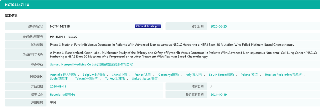 目前,一项吡咯替尼对比多西他赛治疗含铂化疗失败的HER2突变的晚期非鳞状非小细胞肺癌的国际多中心III期临床研究(NCT04447118)正在进行中。