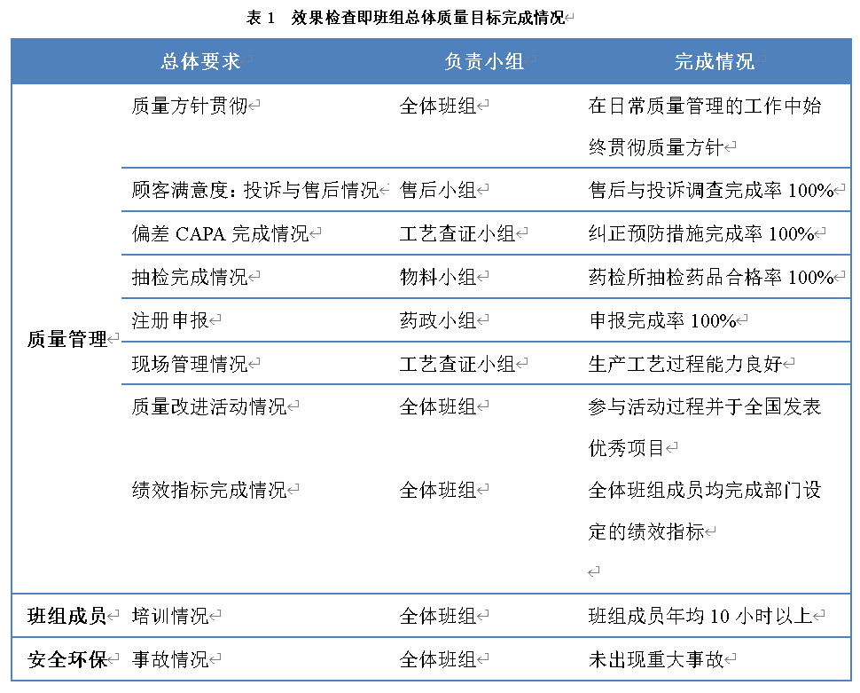作为企业质量管理体系的核心,在严格施行药品生产质量管理规范、药品管理法等法律法规的前提下,并根据ISO9001质量管理体系中的内容,参考SIAOR方法,结合企业质量方针和总体质量目标,充分理解顾客的要求,班组的目标即为“质量信得过班组”的核心思想:坚持质量第一,致力于全厂推广先进质量理念,售后与投诉调查完成率100%,偏差CAPA完成率100%,确保产品监督抽检合格率100%。