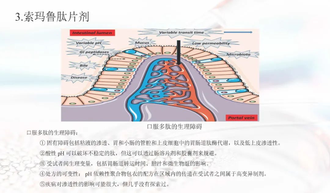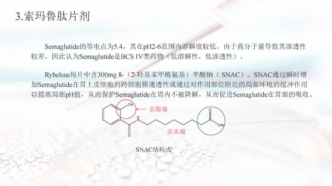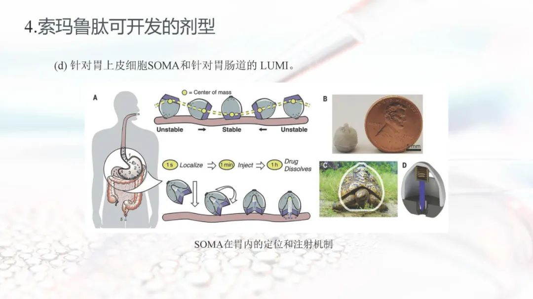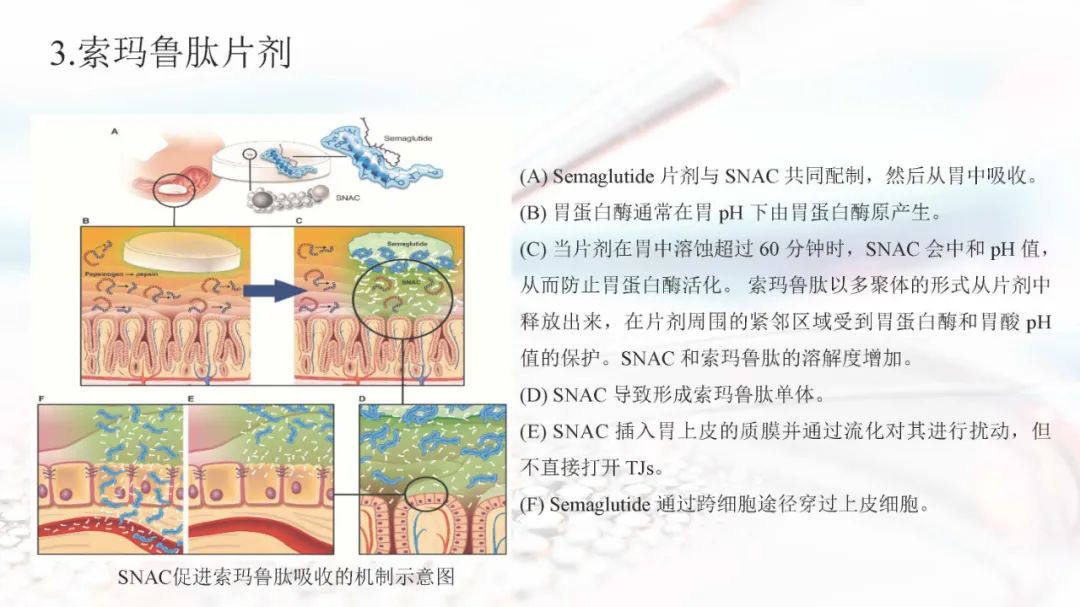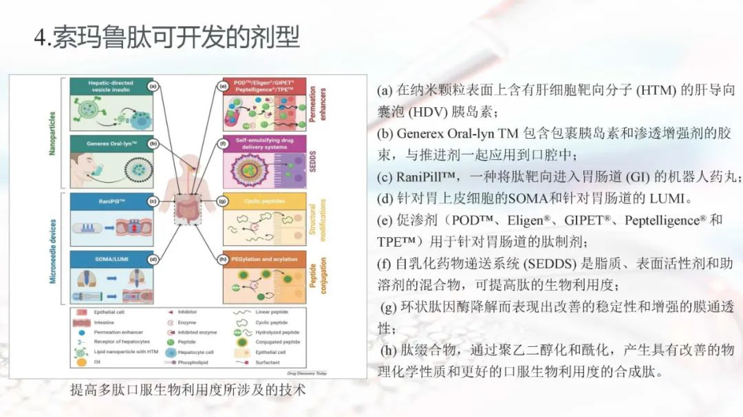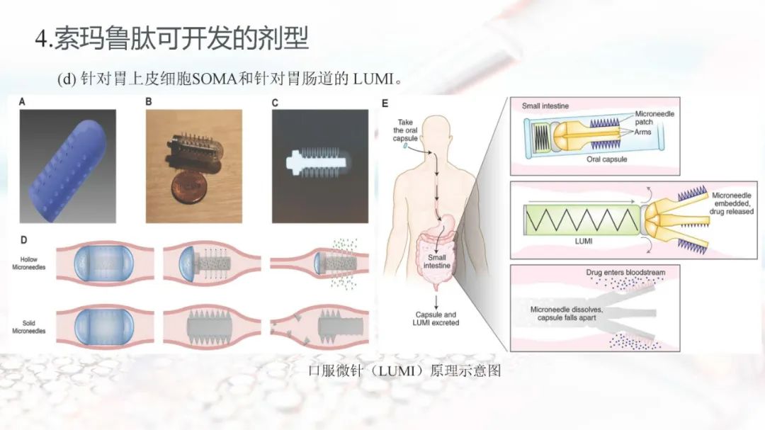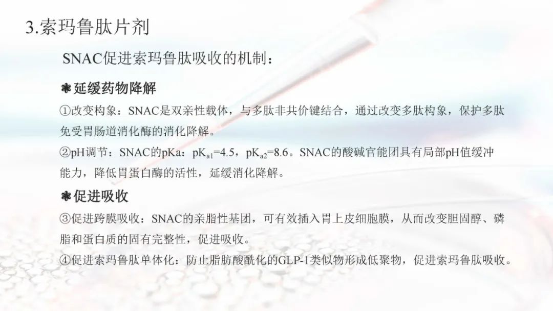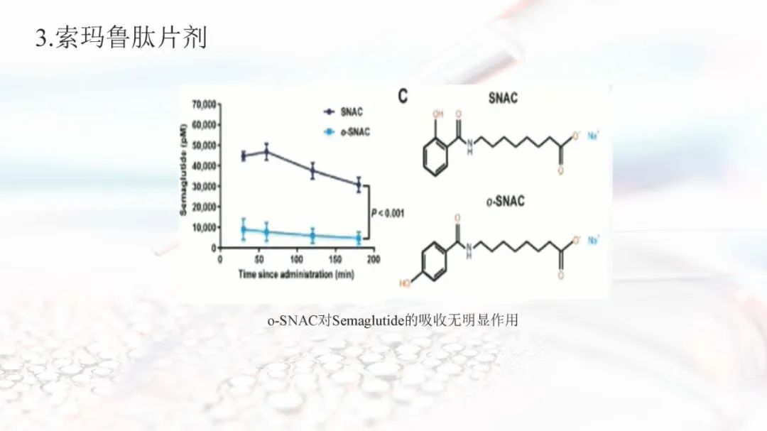 索玛鲁肽目前上市的剂型有注射剂和片剂。索玛鲁肽片剂面临着生物利用度的重大障碍,在胃肠道中稳定性差,难以穿透上皮吸收,以及多变的药代动力学,使得其通过口服达到全身水平具有较大的挑战。索玛鲁肽片剂目前已被EMA、FDA、PMDA等批准,是30多年来口服肽类递送的重要里程碑。