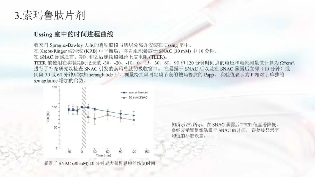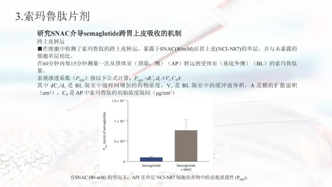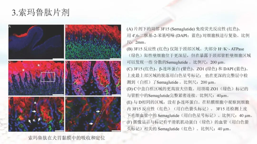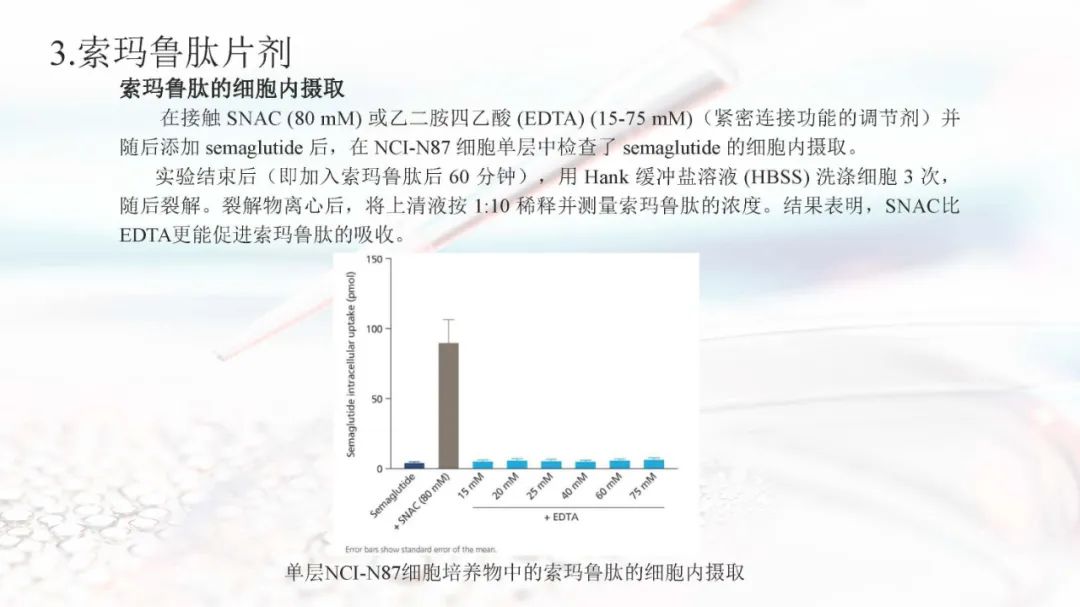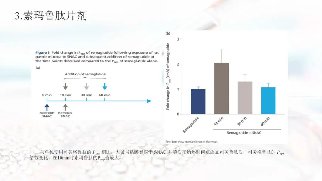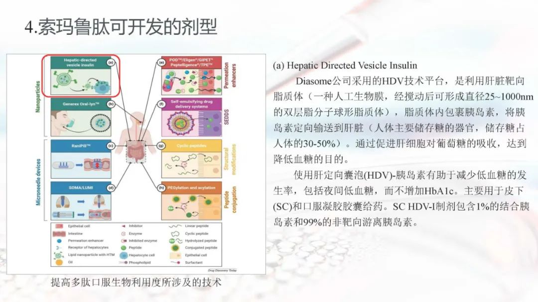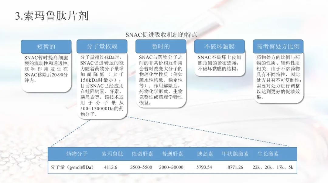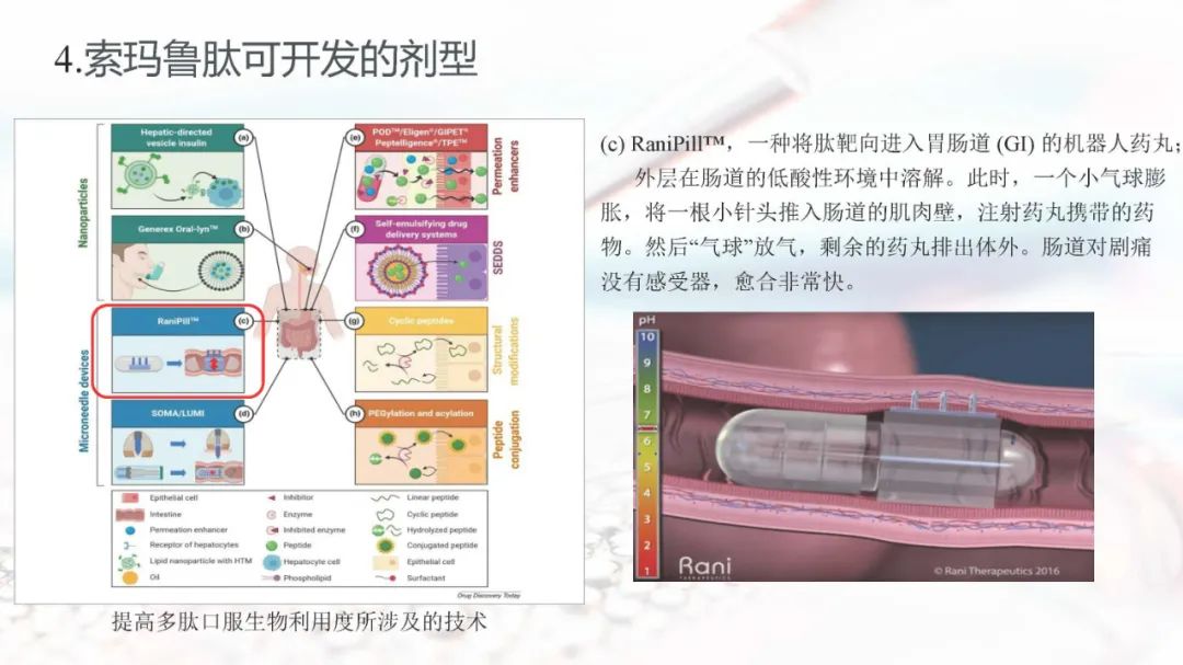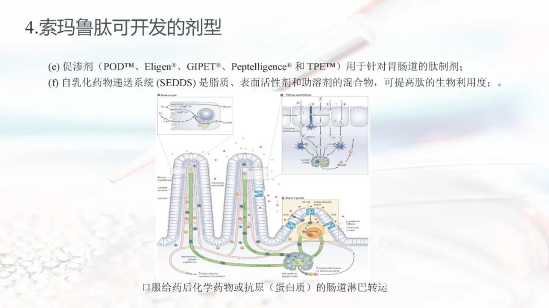 索玛鲁肽目前上市的剂型有注射剂和片剂。索玛鲁肽片剂面临着生物利用度的重大障碍,在胃肠道中稳定性差,难以穿透上皮吸收,以及多变的药代动力学,使得其通过口服达到全身水平具有较大的挑战。索玛鲁肽片剂目前已被EMA、FDA、PMDA等批准,是30多年来口服肽类递送的重要里程碑。