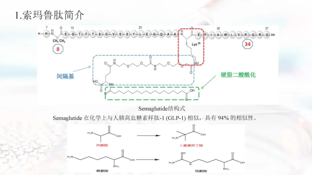 索玛鲁肽(Semaglutide)是由Denmark的诺和诺德公司(Novo Nordisk)开发的新一代GLP-1(胰高血糖素样肽-1)类似物,分子式为C187H291N45O59,分子量为4113.58。索玛鲁肽是基于利拉鲁肽基本结构,并在利拉鲁肽结构的基础上进行了优化:将利拉鲁肽第8、26位的丙氨酸、赖氨酸改为2-氨基异丁酸、精氨酸,并加入间隔基(PEG链),并采用硬脂二酸酰化所得。该结构不仅提高了索玛鲁肽的药效,且延长了索玛鲁肽的半衰期。