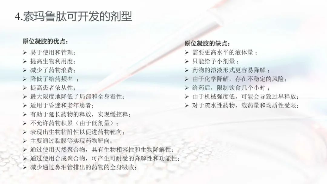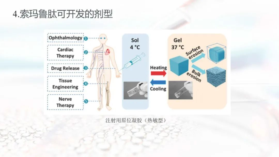 最近诺和诺德2022年财报发布:仅索马鲁肽全球销售额就高达109亿美金,成为诺和诺德产品管线中的潜力产品。2022年索玛鲁肽(注射剂、片剂)在国内的销售额高达22.41亿人民币,巨大的销售市场使索玛鲁肽成为了国内众多医药公司争相进行仿制、改良的品种。而对于索玛鲁肽,可进行新的口服递送系统的重新定位,亦或是设计成长效注射剂(LAI)等,从新的角度对索玛鲁肽的递送系统进行研究,主要是设计出患者顺应性更高的制剂。本节就索玛鲁肽可开发的剂型进行分析和讨论。欢迎各位同行积极讨论。