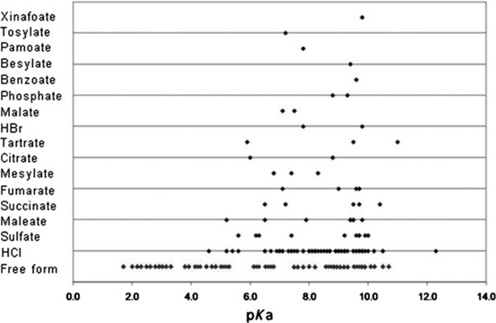 此外,由于pHmax与pKa密切相关,有学者综述了203种市售化合物,将其活性成分的pKa与成盐形式作图(图 6)。从图中观察到pKa小于4.6的弱碱性化合物没有一款成盐。作者得出结论,pKa小于5的碱性化合物更难形成盐,或者说盐不稳定的风险很大。此外作者还根据pKa值将弱碱性药物分为三个区域。第一区(pKa 1-4)是弱碱歧化的高风险区,首选游离形式,第二区(pKa 4-8)需要评估弱碱盐的歧化趋势和生物利用度,第三区(pKa 8-10)成盐对生物利用度的益处最小。