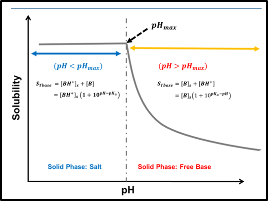 从弱碱盐化合物溶解度随pH的变化图(图 2)可以看出,随着pH减小,游离碱向盐转化,溶解度逐渐升高,当达到某个pH值后,所有化合物分子都成盐,此时溶解度达到最高,此时的pH即为pHmax。环境pH大于pHmax时,盐将不成比例形成溶解度较低的游离碱,即发生盐歧化。因此pHmax越大,越不容易发生盐歧化,pHmax越小,越容易发生盐歧化。