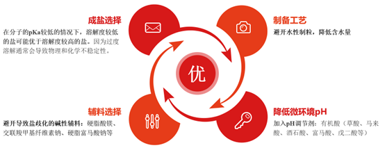 在制备工艺的选择上,由于水分会促进弱碱盐歧化,所以应该避开水性制粒,降低含水量。