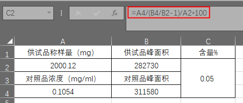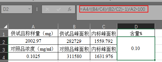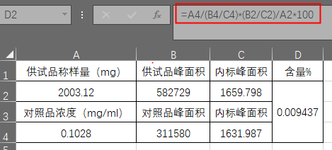 可避免因样品前处理及进样体积误差对测定结果的影响,又能排出基质干扰。通常在气相色谱中使用,标准加入内标法中,采用对照品峰面积/内标物峰面积,带入外标法公式计算即可,公式如下: