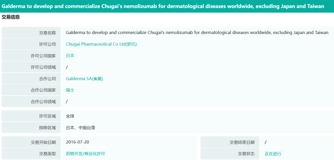 药融圈获悉,Nemolizumab最早由罗氏控股旗下日本中外制药(Chugai Pharmaceutical)开发,研发代号CIM331,该抗体基于中外制药的抗体工程技术ACT-Ig开发,该技术可延长抗体在血液中的半衰期。2016年9月,中外制药在完成湿疹中重度瘙痒的II期临床研究后将其权益转让,将日本的权益授权给日本制药公司Maruho,中外制药则保留开发血液透析患者瘙痒适应症的权益,而高德美拥有除日本和中国台湾地区之外的权益。此前,Nemolizumab治疗结节性痒疹相关瘙痒适应症在2019年获得美国FDA授予的突破性疗法认定。