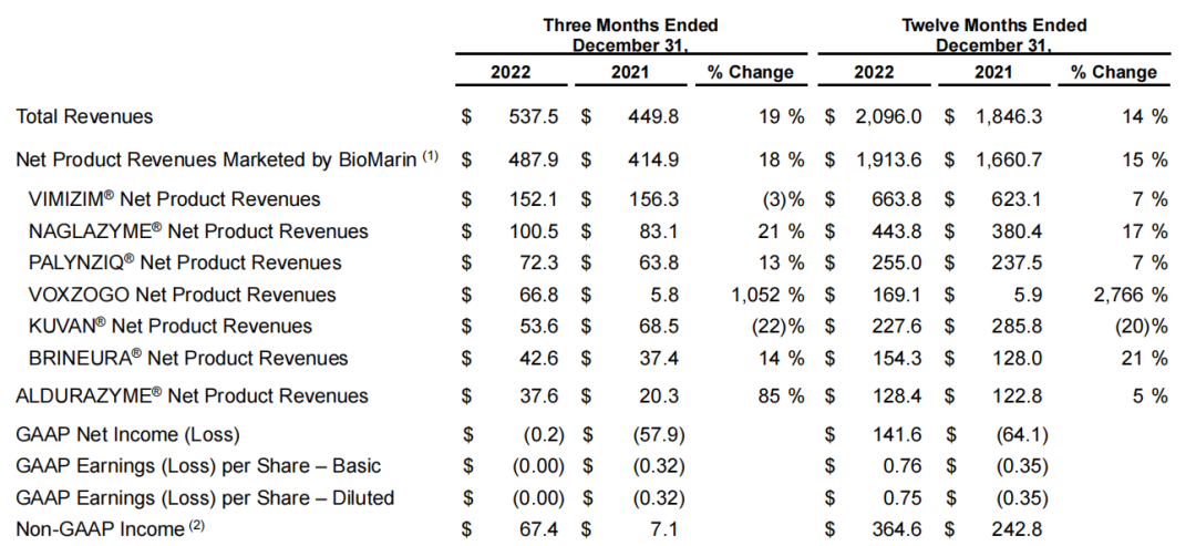 近期,罕见病龙头公司BioMarin Pharmaceutical Inc.(拜玛林制药公司)发布财报:2022年总收入达到21亿美元,同比增长14%;研发费用支出6.5亿美元,同比增长3%;净利润1.42亿美元,扭亏为盈。目前公司已经有8个商业化产品,主要以治疗罕见病为主,前三大产品去年销售情况如下: