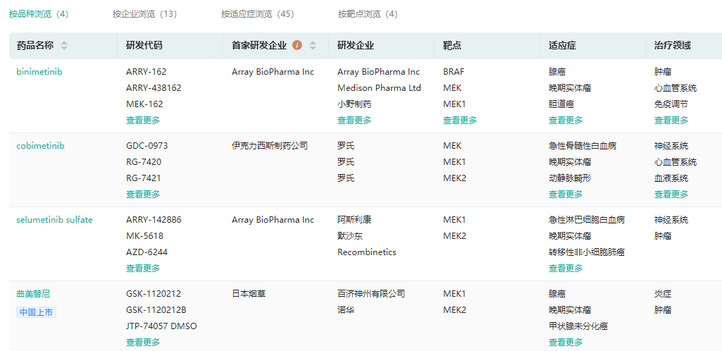 全球批准上市的MEK1/2抑制剂(部分)