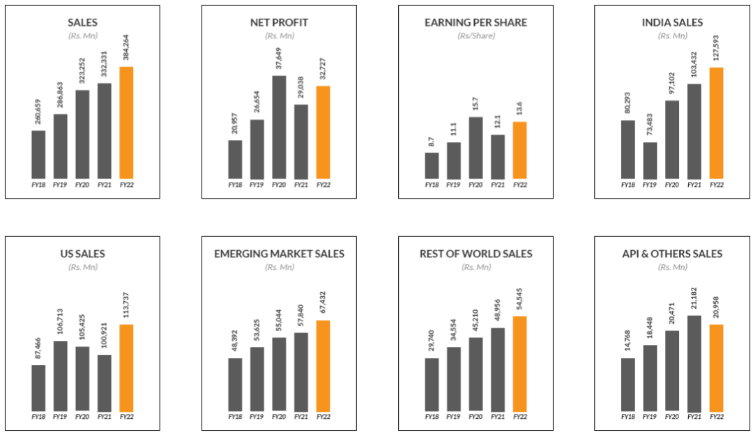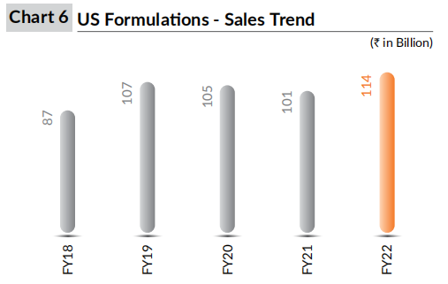 美国市场营收增长了约13%,达到1140亿卢比,占22财年综合收入的约30%。虽然仿制药业务继续面临价格侵蚀,但公司能够通过新产品的推出和高效的供应链来部分弥补这一损失。