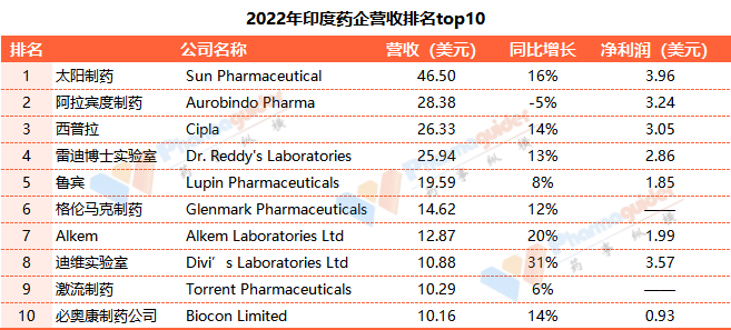 我们根据印度21-22财年营收数据统计,前10大药企如下: