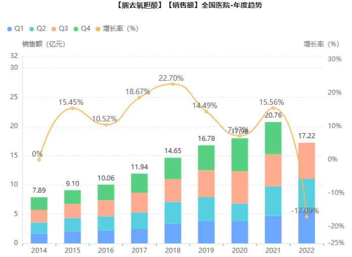 熊去氧胆酸原研来自德国Dr Falk福克大药厂,临床上主要用于治疗固醇性胆囊结石、胆汁郁积性肝病和胆汁反流性胃炎等疾病,在体内溶解胆固醇结石的效果较好,且副作用相对较少,属于主流的利胆药。