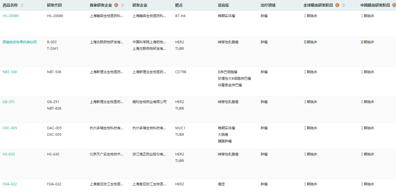 国内在研ADC药物信息查询(部分)