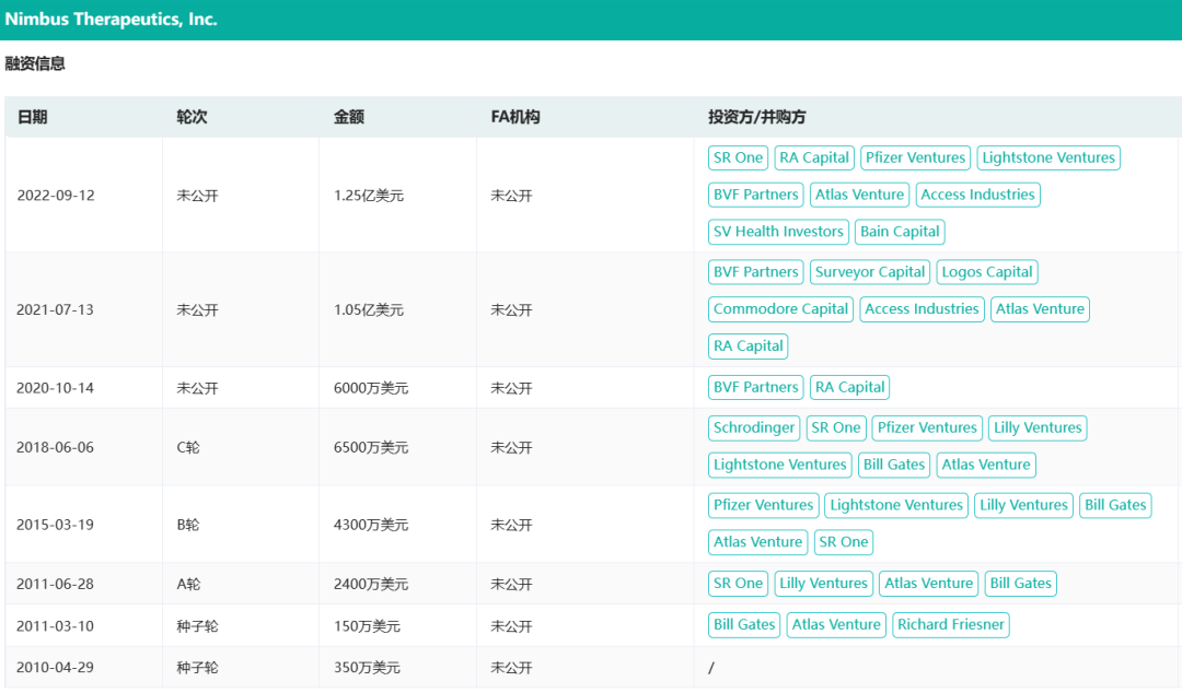 从融资情况来看,Nimbus Therapeutics获得了不少顶级生命科学投资机构的支持,自2011年以来,该公司已获得超过4亿美元的私人投资,最近一次是在2022年9月获得1.25亿美元的融资。根据药融云数据库及企业公开信息,其主要投资者包括Access Biotechnology、Atlas Venture、贝恩资本、BVF Partners,以及礼来基金、辉瑞风投等。