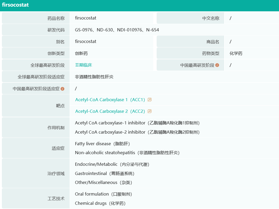 ACC是参与脂肪从头合成的酶,其活性或基因表达增加可促进脂肪合成。药融圈旗下药融云数据显示,此前,Firsocostat已获得美国FDA授予的快速通道资格,用于非酒精性脂肪性肝炎。另据披露,吉利德正与诺和诺德合作开展FXR激动剂(Cilofexor)联合Firsocostat以及GLP1激动剂(司美格鲁肽)治疗非酒精性脂肪性肝炎(NASH)的2期临床试验。