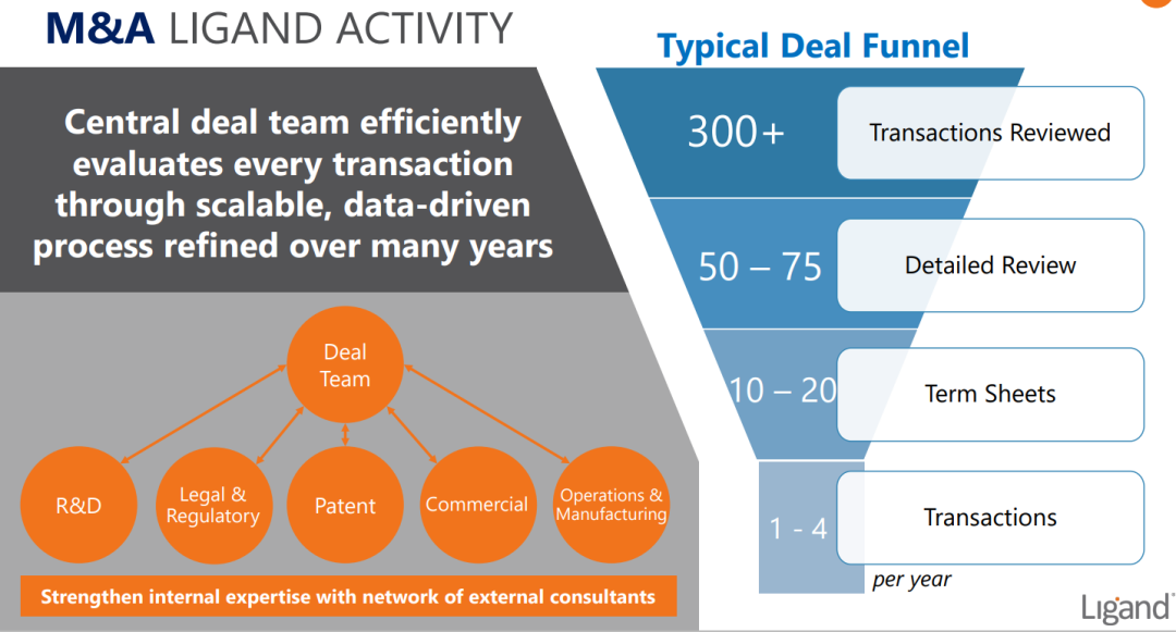 此外,合同交易是Ligand增长战略的重要组成部分。Ligand将交易达到了一种“机械化”的程度,将其融入了公司文化中。其经验丰富的中央交易团队通常每年审查约300个交易机会。通过各阶段的筛选,最终只剩下少数几笔真正的进展。