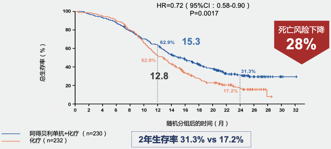 mOS:15.3个月 vs 12.8个月,2年OS率:31.3% vs 7.2%,1年OS率:62.9% vs 52.0%,2年OS率:31.3% vs 17.2%。