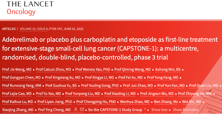 此前在2022年5月,阿得贝利单抗联合化疗一线治疗ES-SCLC的疗效和安全性的CAPSTONE-1研究成果正式全文发表于《THE LANCET Oncology》。(由中国医学科学院肿瘤医院王洁教授和吉林省肿瘤医院程颖教授共同担任主要研究者)