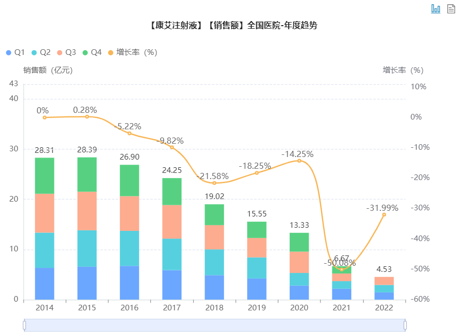 据药融云统计,康艾注射液2014年-2022年前三季度的累计销售额已达到166.93亿元,在2021年以前一直都是院内抗肿瘤中成药的桂冠品种。但从年度销售额来看,近年来却在走下坡路,市场规模已从2014年的28.31亿缩至2021年的6.67亿,现2022年前三季度的销售额也不太乐观。尤其在2021年,销售额直降50%,以至于把抗肿瘤中成药市场榜一的地位拱手让人。