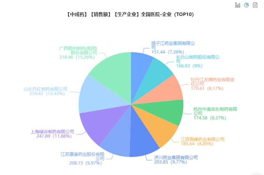 据药融云全国医院销售数据库统计,近年来中成药在我国院内的市场已趋于稳定,年销售额均超一千亿元,最高可达1447.95亿。在中药研发上,国内药企可谓是百花齐放、百家争鸣,市场份额占比较为平均,其中广州梧州制药、山东丹红制药、上海绿谷制药近年来累计药品销售额占比均超10%。