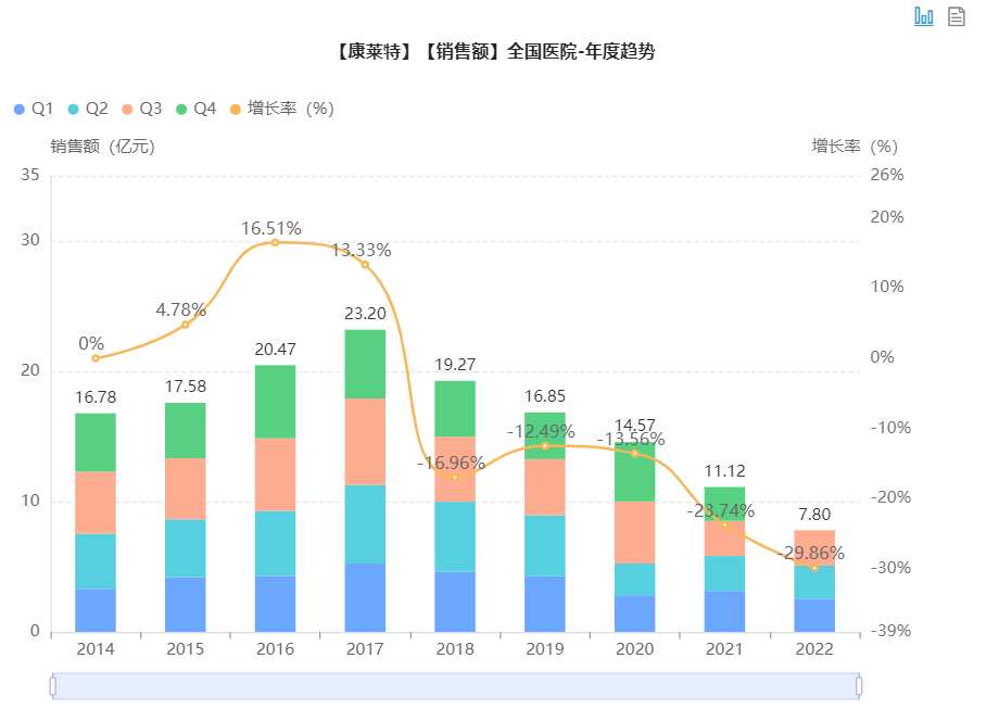 据药融云数据库显示,康莱特有注射液与胶囊两种制剂,但康莱特注射液才是主力品种,八成市场都由其贡献。据统计,康莱特的整体院内销售市场起伏较大,最高于2017年达到了23.2亿元,此后就出现了持续下滑。虽然在2018-2020年市场出现急剧缩小,但康莱特注射液却依旧霸占了抗肿瘤中成药院内市场TOP1的位置三年。到2021年,康莱特的销售额已仅有11.12亿,2022年前三季度的销售额为7.8亿,还不及去年同期,预计全年依旧不太乐观。