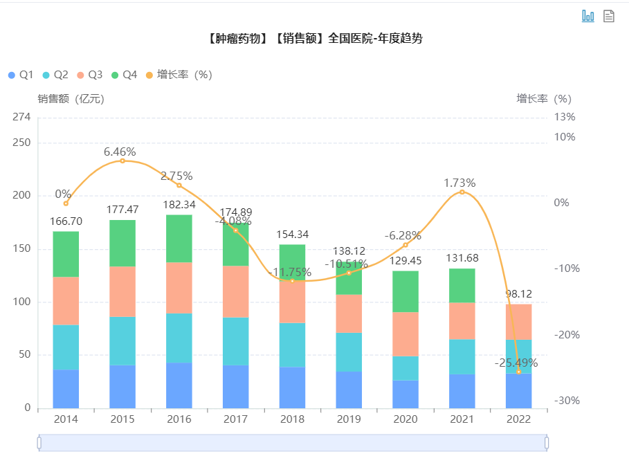 抗肿瘤中成药院内销售情况(2014年-2022年前三季度)