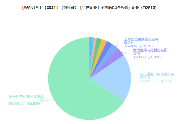 药融云全国医院销售(全终端)数据库显示,2021年银杏叶片在全国医院终端市场销售规模达到12.9亿元,其中扬子江药业占据了65.83%的市场份额,其次是康恩贝制药、信邦制药、信谊百路达药业,分别占据18.77%、3.16%、2.91%。