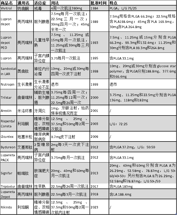 药剂学上将微球定义为药物溶解或分散于高分子材料中所形成的微小球体或类球体,早在上世纪80年代,美国的微球技术就已经成熟,第一个产品于1984年获得了FDA批准。因微球注射剂可大幅延长药物的作用时间、减少用药次数、改善患者的顺应性的优点,已经成为药物改良的一大方向,截止目前,FDA已经批准了近20个微球产品,药物涉及纳曲酮、亮丙瑞林、奥曲肽、生长激素、米诺环素、曲普瑞林、帕瑞肽和利培酮等,FDA批准的微球产品如下表所示: