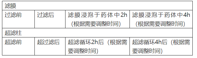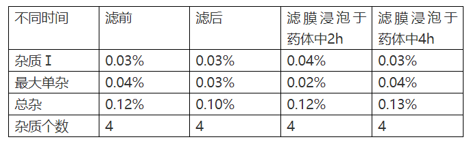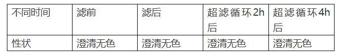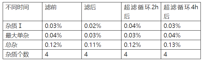 考察过滤后,不同时间过滤后,超滤后,不同时间超滤后较过滤和超滤前的杂质个数是否增加,杂质水平是否有明显的增加,药液的性状变化能对工艺中的过滤和超滤组件与药液的相容性进行有效的考量。