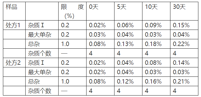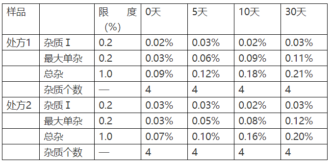 在设计的影响因素取样点取样测定关键指标有关物质,在扣除处方3的色谱峰后,考察处方2相比于处方1,杂质个数是否增加,杂质水平是否有明显的增加。