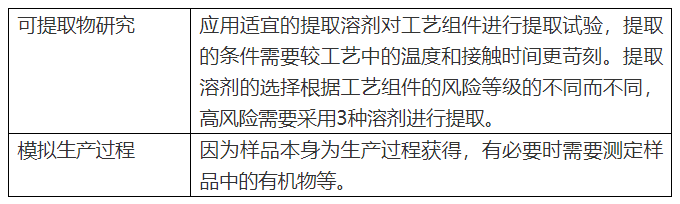 可提取物研究考察的指标:根据毒理学评估,需要关注的元素,有机物和特殊化合物进行考察。素方法学验证的项目包括:专属性、线性、定量限、准确度、精密度(重复性、中间精密度)、溶液稳定性。根据毒理学阈值评估,有机物进行相应的方法学研究。有机物方法学验证的项目包括:专属性、线性、定量限、准确度、精密度(重复性、中间精密度)、溶液稳定性和耐用性。