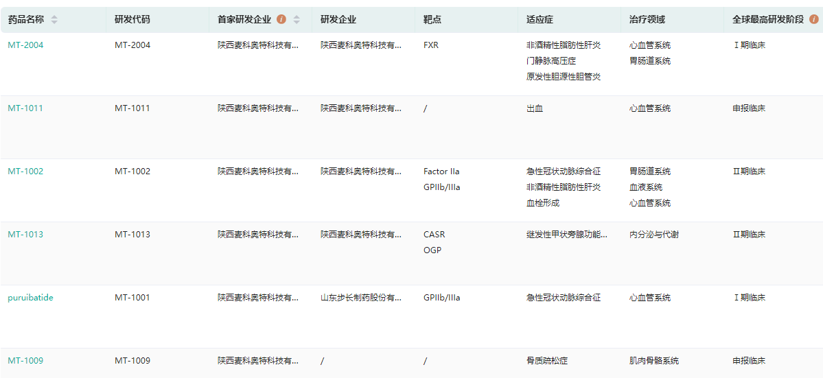 该公司具有抗凝血酶及抗血小板作用的双拮抗剂MT1002、治疗非酒精性脂肪性肝病的FXR激动剂MT2004、双靶点肽类新药MT1013、针对缺血性脑卒中神经修复的MT200605等早先均已经在美国获批开展临床研究。