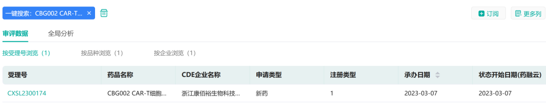 3月7日,据药融云数据库显示,浙江康佰裕生物科技有限公司提交的"CBG002 CAR-T细胞注射液"临床试验申请获得受理(受理号:CXSL2300174)。