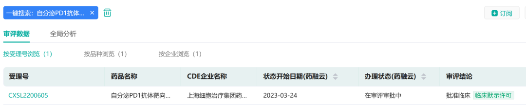 3月24日,据药融云中国药品审评数据库显示,上海细胞治疗集团的自分泌PD1抗体靶向间皮素嵌合抗原受体T细胞注射液获得临床试验默示许可,适应症为间皮素阳性的晚期恶性实体肿瘤。