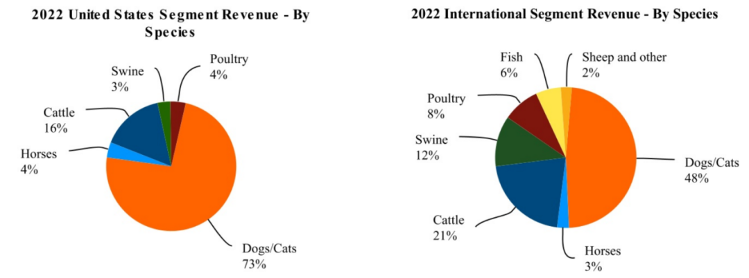 国际业务占公司总收入的46%,为36.81亿美元,同比增长1%。而在国际业务中,来自中国的收入高达3.82亿美元,是公司除美国之外的第二大市场。其中,国际业务伴侣动物产品收入为18.62亿美元,同比增长10%,主要来自于皮肤科产品销售额增长,还包括新推出的单抗产品Librela(bedinvetmab)和Solensia(frunevetmab),以及Simparica(沙罗拉纳)的增长;畜牧动物产品收入为18.19亿美元,同比减少7%,虽然针对鱼、羊、家禽和牛的产品销售额增加,但部分被针对猪的产品销售减少所抵消。